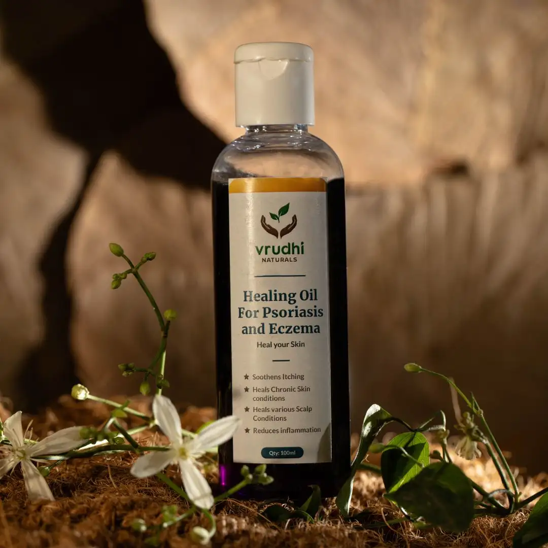 As the name implies, Vrudhi healing oil alleviates irritation, itching, and inflammation in the skin. The oil’s all-natural recipe and ingredients combine the nourishing and protecting characteristics of Virgin Coconut oil and Wrightia Tinctoria to help treat eczema, psoriasis, and dermatitis.