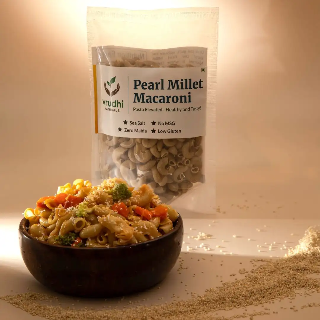 Vrudhi Millet Macroni stands out with its simplicity and a touch of Indian healthfulness. Loved by kids and cherished by health enthusiasts, our macaroni is a testament to our dedication to bring you a low-gluten, millet-infused alternative.